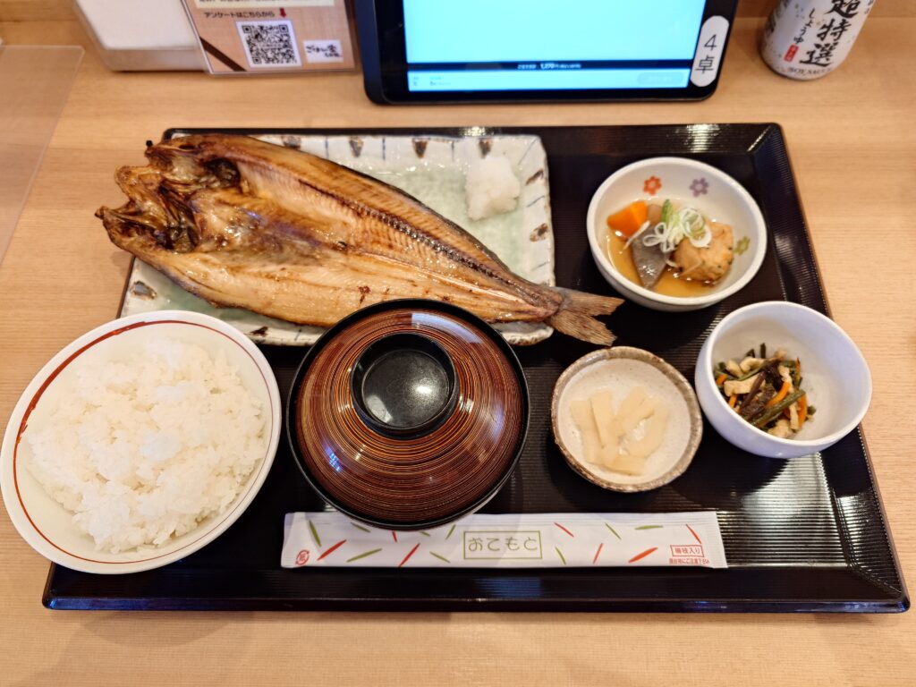 案内されたカウンター席でタブレットメニューを確認し、焼魚カテゴリから真ほっけ一夜干し定食(1270円)を選択しました。ほっけの一夜干しを口にするのは久しぶりでしたが、空腹だったこともあり大判サイズも問題なく楽しめるだろうと判断しました。