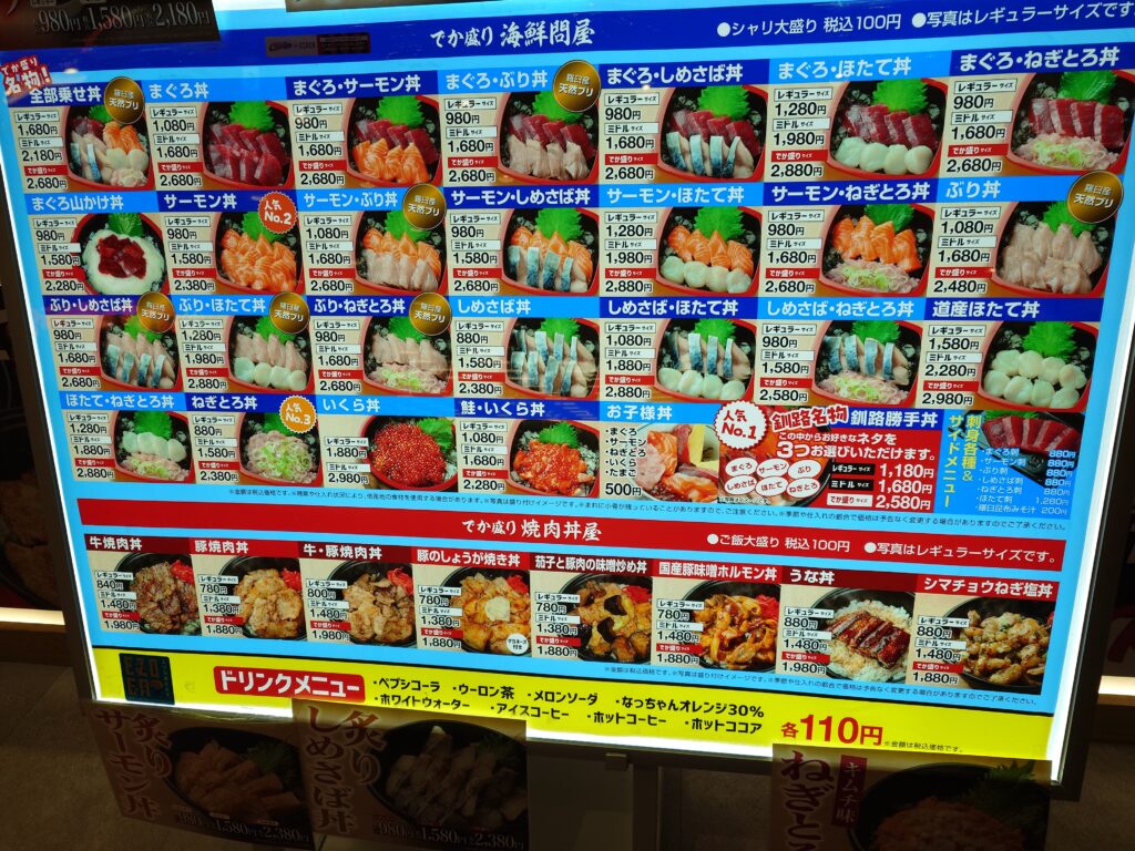 メニューは多彩で、その中から好みのネタを選べる「釧路勝手丼(1180円)」を注文しました。